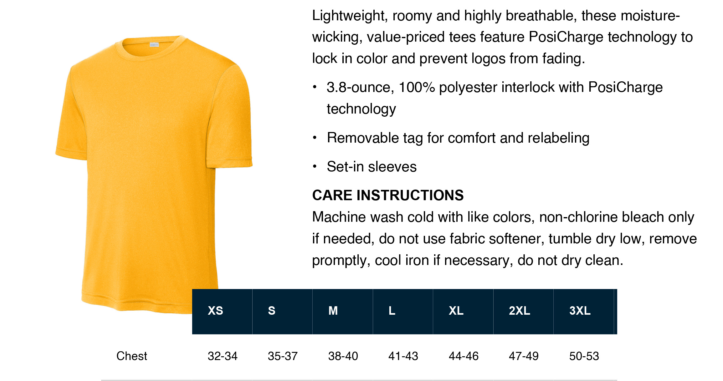 - 3.8-ounce, 100% polyester interlock with PosiCharge technology